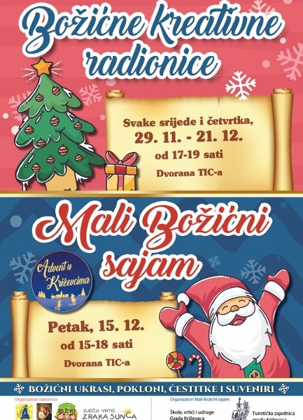 Turistička zajednica grada Križevaca u suradnji s križevačkim obrazovnim institucijama i udrugama organizira Mali božićni sajam. Dođite u petak, 15. prosinca, od 15 do 18 sati, u Turistički informativni centar te budite i Vi dio našeg božićnog sajma. U veselom blagdanskom raspoloženju možete razgledati te nabaviti božićne ukrase i radove malih i velikih ruku djece iz vrtića, škola i udruga.